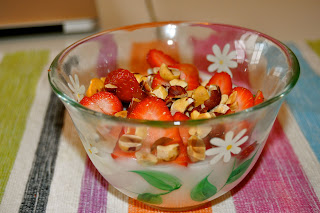 I’m also eating my favorite snack right which also is a great dessert in my opinion. It’s fruit parfait with plain yogurt, strawberries and chopped nuts. I used homemade coconut yogurt so my parfait was “raw” but any yogurt will do.I was so excited when I found local and organic strawberries at the farmers market so now we’re enjoying these small and sweet berries.