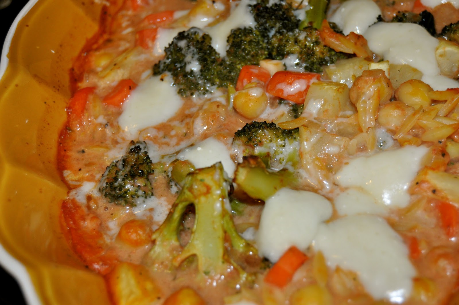 Heat oil in a saucepan on medium heat and sauté onion until glossy not brown. Add and cook celeriac, carrots for a couple of minutes. Add stock, liquid aminos, tomatoes, tomato puree, garlic salt and chili and bring to a boil. reduce to a simmer for 5 minutes. Add broccoli and cook another 4 minutes. If needed, add salt & pepper. Stir in the cream, cream cheese, chick peas and herbs provencal. Place orzo in the bottom of a baking dish. Pour the topping over in a even layer. bake for 15 minutes. Sprinkle cheese over and bake another 5-7 minutes, until cheese has melted.