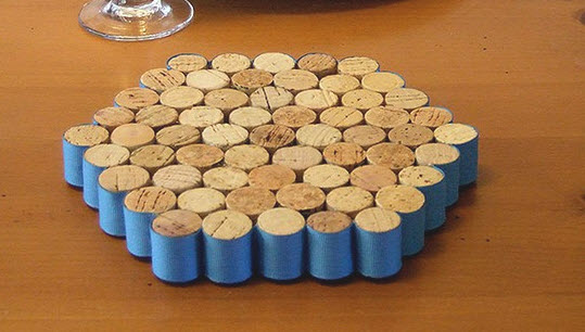 Glue a few dozen corks standing up together, and tie with a pretty ribbon for a charming trivet. Use the same technique on a smaller scale with corks sliced in half crosswise to make coasters. Or glue together a few dozen cork coins in an organic pattern for a table topper. Or cover an entire old table with cork and top it with glass.